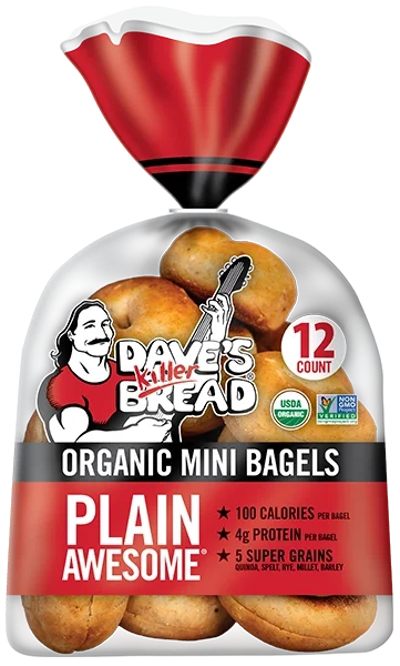 Our Mini Bagels are the perfectly sized way to bring big flavor to busy mornings. USDA organic and Non‑GMO Project Verified, these soft, delicious mini bagels deliver a powerhouse combo that fuels your day the “killer” way. 4g protein, and 100 calories per bagel. Baked with a signature blend of five super grains—including organic quinoa, spelt, rye, millet, and barley, and 17g whole grains per serving (3 bagels).