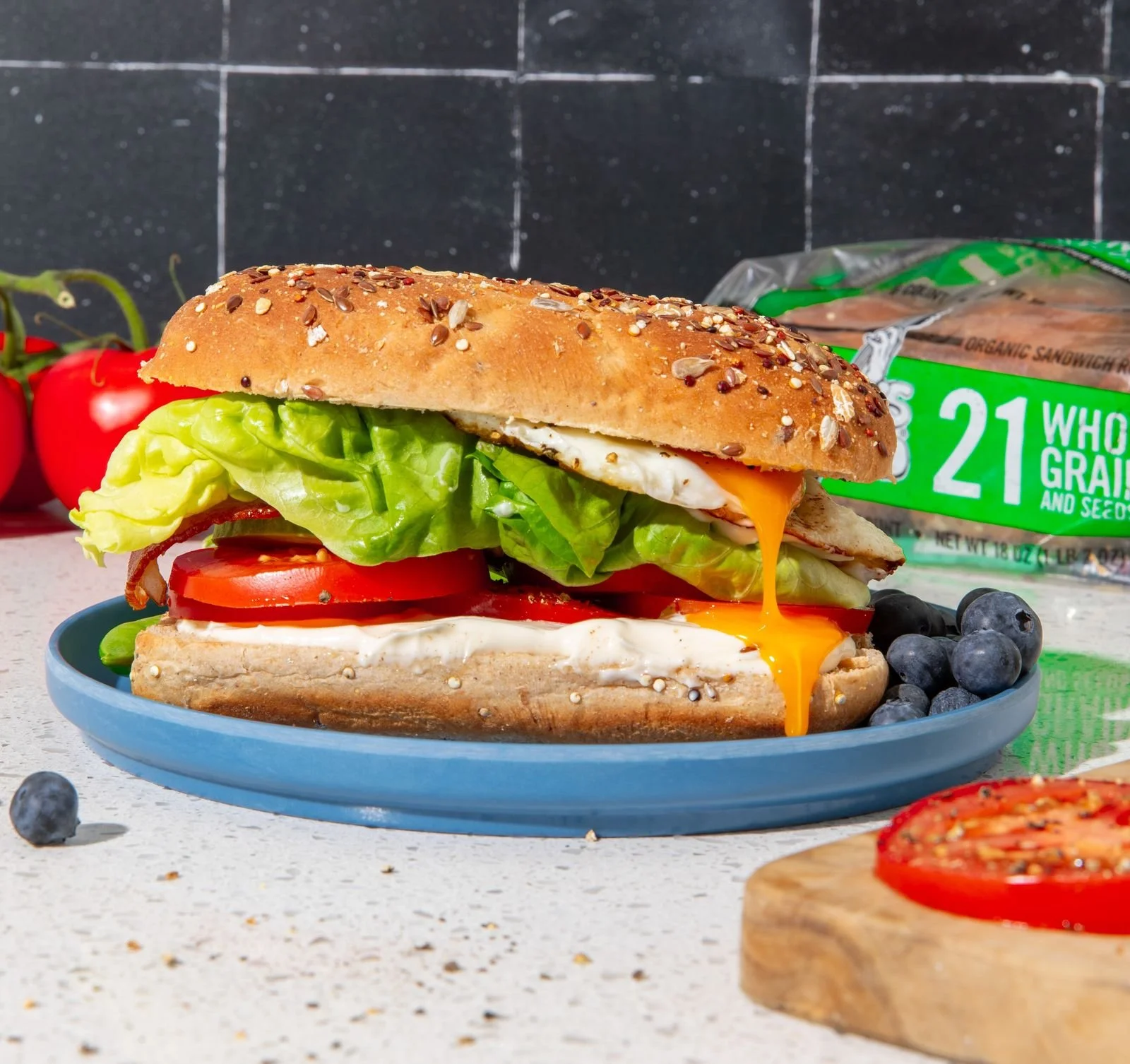 Assemble BLT: layer garlic aioli on bottom bun followed by tomatoes, avocado, bacon, lettuce, and fried egg. Top with sandwich roll and enjoy!
