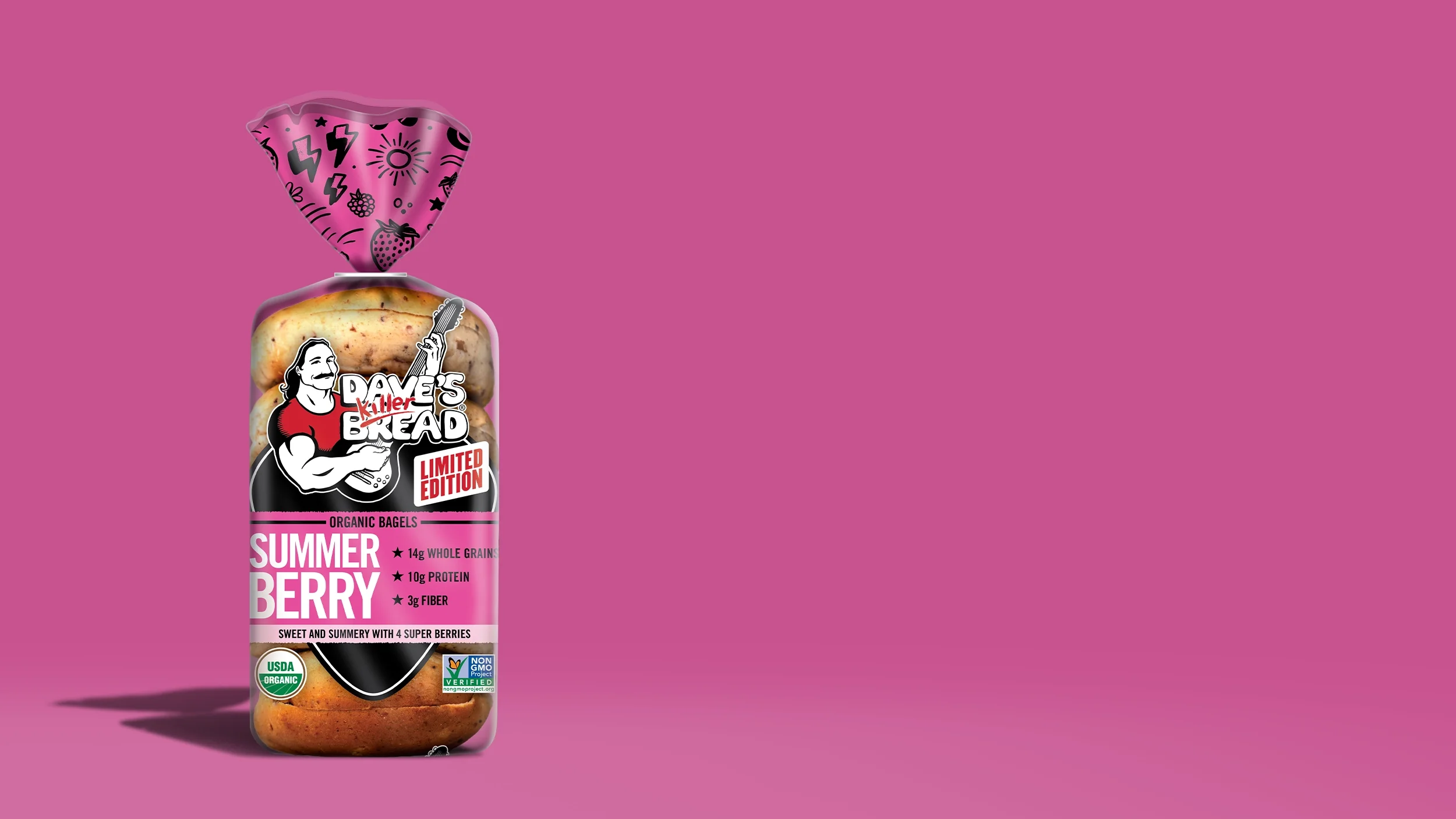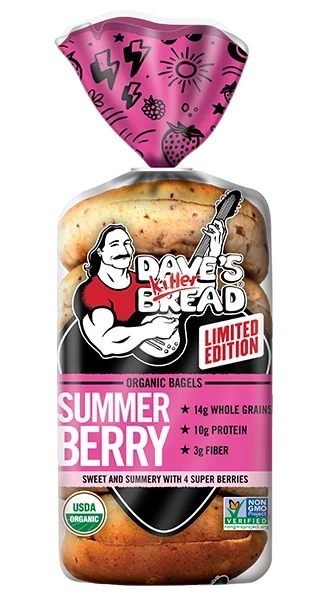 Limited Edition Summer Berry Bagels bring a bright, fruity twist to your everyday breakfast routine. Bursting with berry flavor and hearty whole grain nutrition, these soft, satisfying berry bagels deliver a crave‑worthy balance of subtly sweet taste and signature Dave’s texture in every bite. 14g whole grains, 10g protein, and 3g fiber. Our organic berry bagels help keep you fueled and satisfied all morning long. Made with organic ingredients and 4 super berries (blueberry, raspberry, cranberry, and strawberry), these bagels offer feel‑good nutrition without sacrificing flavor.